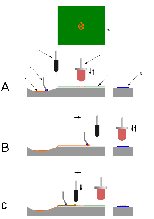 - 從起始位置開始,密封的墨杯(倒置的盛有墨水的杯子)位于印版蝕刻圖稿區(qū)域上方,覆蓋圖像并用墨水填充圖像。